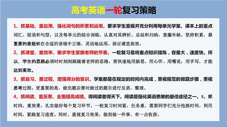 1、抓基础、重应用、强化词句的积累和运用。要求学生重视并充分利用每单元学案、课本上的重点词汇、短语和句型,以及每单元的综合训练,认真对其辨析、总结和归纳,查漏补缺,坚持积累,最重要的是能够在合适的语境中正确、灵活地运用。保证课堂高效。2、抓课堂、重效率、要求学生紧跟老师的节奏。一轮复习是将重点知识提炼,容量大,速度快。所以,学生的思路必须时时刻刻跟随着老师的思路,要快速地用脑思,用心听、用嘴说,用手写,才能达到高效。3、抓自习、重过程、增强得分的意识。学案都是在规定的时间内完成,重视规范的做题步骤,重视思考过程。更重要的是,做完题后要对做过的题目进行反思、整理。4、抓阅读、重反思、全面提高成绩。得阅读者得天下。阅读是强化英语思维的最佳途径之一。5、抓时间,重效果,扎实做好每个复习环节。一轮复习时间紧,任务重,需要同学们充分抢抓时间,利用时间,紧跟复习进度。同时,重视复习效果,做到做一件事,有一点收获。