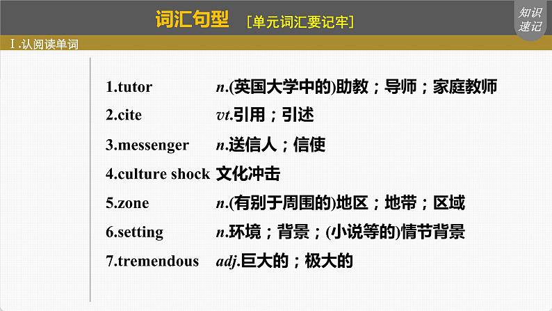 1.tutr n.(英国大学中的)助教;导师;家庭教师2.cite vt.引用;引述3.messenger n.送信人;信使4.culture shck文化冲击5.zne n.(有别于周围的)地区;地带;区域6.setting n.环境;背景;(小说等的)情节背景7.tremendus adj.巨大的;极大的