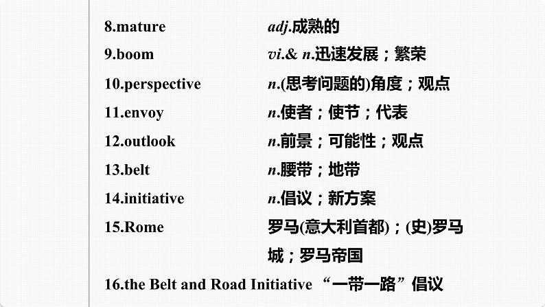 8.mature adj.成熟的9.bm vi.& n.迅速发展;繁荣10.perspective n.(思考问题的)角度;观点11.envy n.使者;使节;代表12.utlk n.前景;可能性;观点13.belt n.腰带;地带14.initiative n.倡议;新方案15.Rme罗马(意大利首都);(史)罗马城;罗马帝国16.the Belt and Rad Initiative “一带一路”倡议