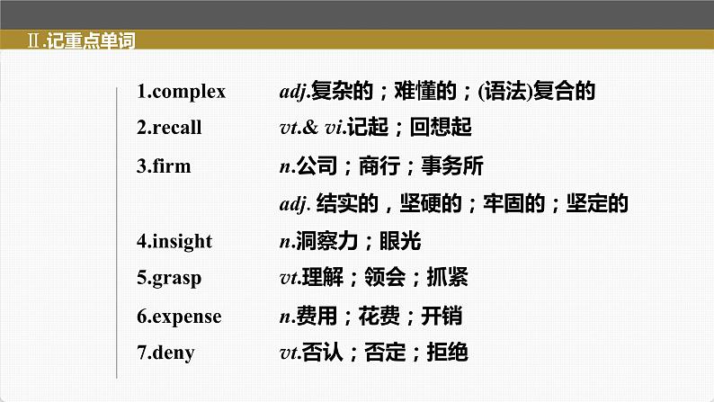 1.cmplex adj.复杂的;难懂的;(语法)复合的2.recall vt.& vi.记起;回想起3.firm n.公司;商行;事务所 adj.结实的,坚硬的;牢固的;坚定的4.insight n.洞察力;眼光5.grasp vt.理解;领会;抓紧6.expense n.费用;花费;开销7.deny vt.否认;否定;拒绝