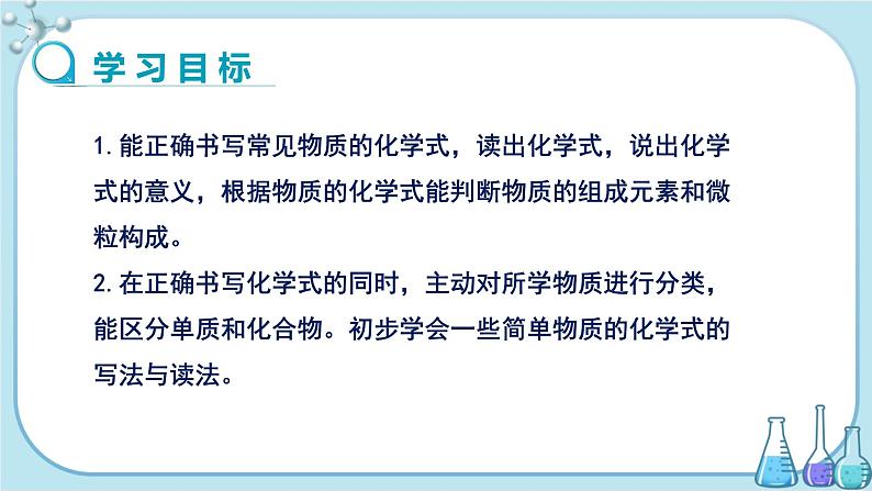 1.能正确书写常见物质的化学式,读出化学式,说出化学式的意义,根据物质的化学式能判断物质的组成元素和微粒构成。2.在正确书写化学式的同时,主动对所学物质进行分类,能区分单质和化合物。初步学会一些简单物质的化学式的写法与读法。