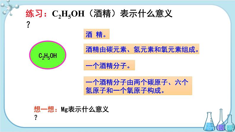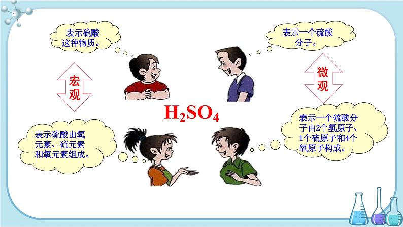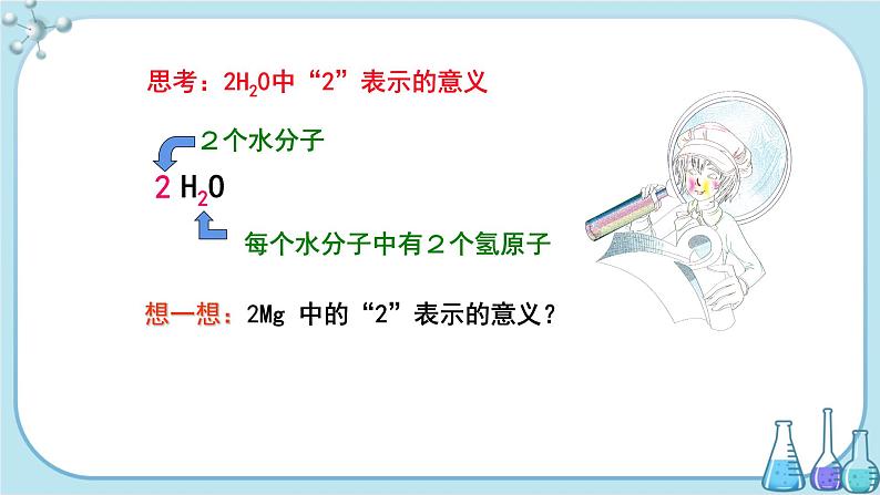 2H :两个氢原子。H2: 一个氢分子由两个氢原子构成。2H2:两个氢分子。Ca2+: 一个钙离子带两个单位正电荷。2Mg2+: 两个镁离子。