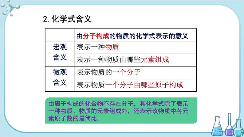 由离子构成的化合物不存在分子,其化学式除了表示一种物质、物质的元素组成外,还表示该物质中各元素原子数的最简比。