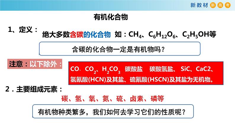 CO﹑CO2、H2CO3 碳酸盐 碳酸氢盐、 SiC、CaC2、氢氰酸(HCN)及其盐、硫氰酸(HSCN)及其盐为无机物。