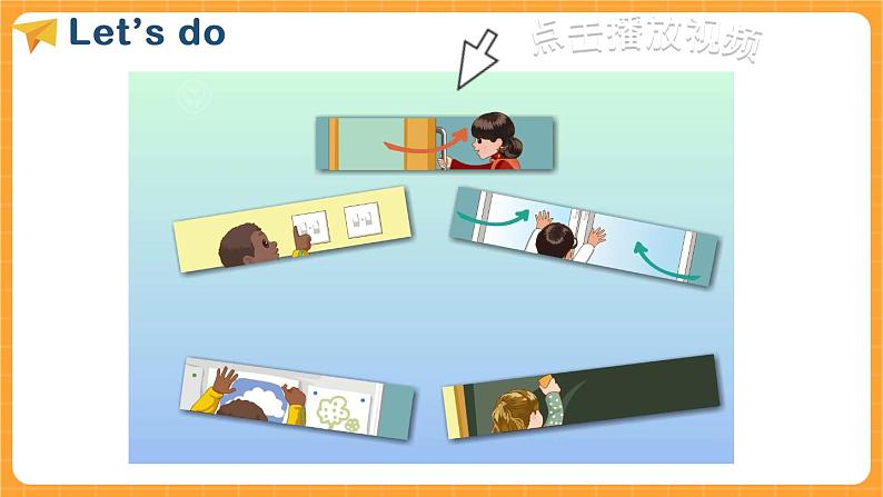 复习上一课时“A. Let’s do”部分的内容,学生边听录音边做动作。