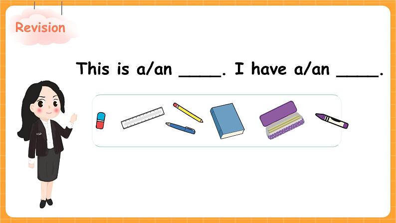 教师展示手中的文具或其他物品:This is a pen. I have a pen. 引导学生说出句子“This is… I have…” 进而提问:Where is it? 启发学生用学过的知识回答:It’s on / in / under the … | ||