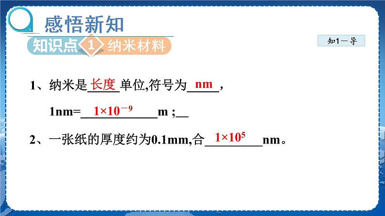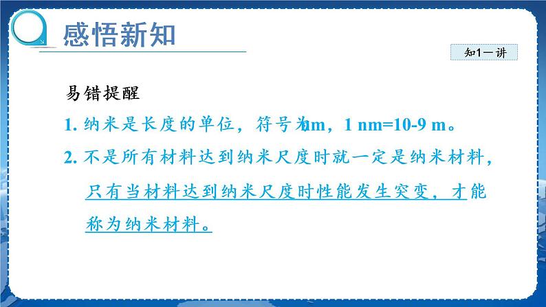 易错提醒1. 纳米是长度的单位,符号为nm,1 nm=10-9 m。2. 不是所有材料达到纳米尺度时就一定是纳米材料,只有当材料达到纳米尺度时性能发生突变,才能称为纳米材料。