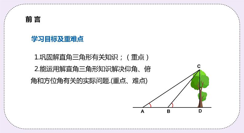 展开1.巩固解直角三角形有关知识;(重点)2.能运用解直角三角形知识解决仰角、俯角和方位角有关的实际问题.(重点、难点)