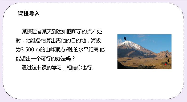 某探险者某天到达如图所示的点A 处时,他准备估算出离他的目的地,海拔为3 500 m的山峰顶点B处的水平距离.他能想出一个可行的办法吗? 通过这节课的学习,相信你也行.