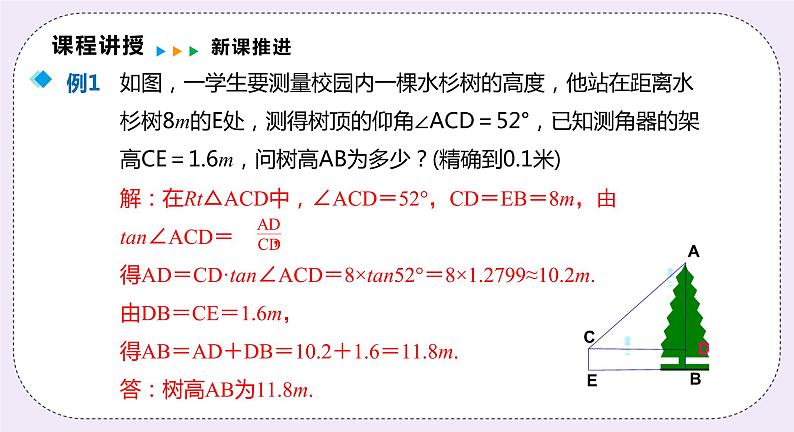 解:在Rt△ACD中,∠ACD=52°,CD=EB=8m,由tan∠ACD= ,得AD=CD·tan∠ACD=8×tan52°=8×1.2799≈10.2m.由DB=CE=1.6m,得AB=AD+DB=10.2+1.6=11.8m.答:树高AB为11.8m.