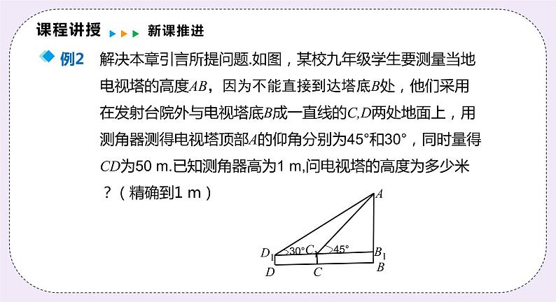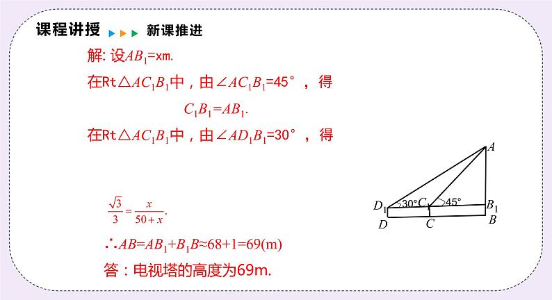 解: 设AB1=xm.在Rt△AC1B1中,由∠AC1B1=45°,得 C1B1=AB1.在Rt△AC1B1中,由∠AD1B1=30°,得