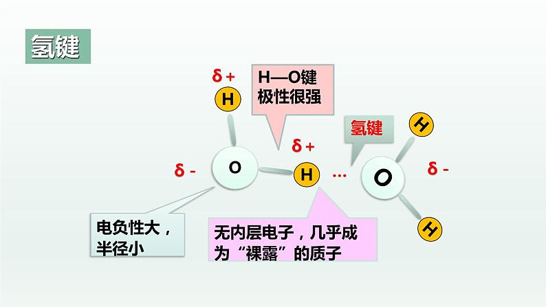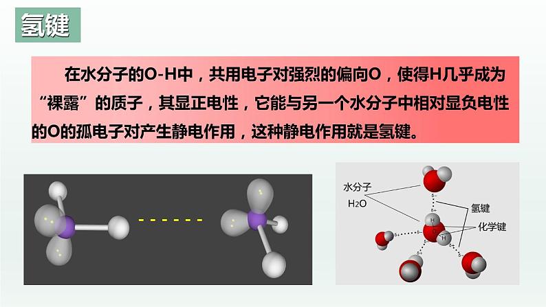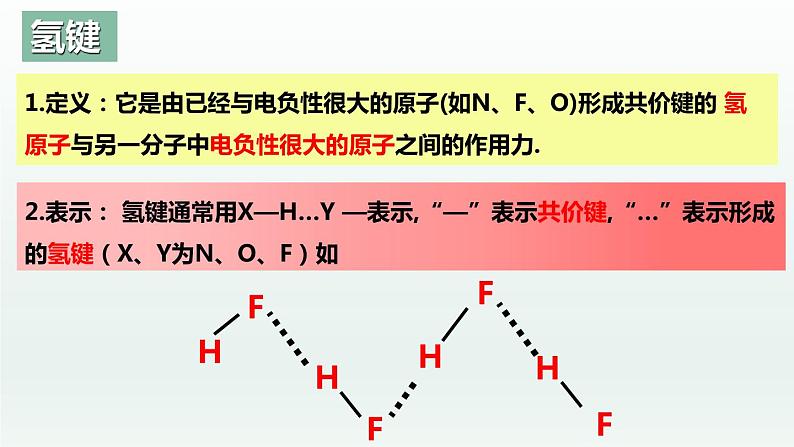 2.表示: 氢键通常用X—H…Y —表示,“—”表示共价键,“…”表示形成的氢键(X、Y为N、O、F)如