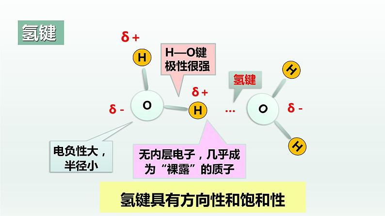(1)饱和性:由于H原子半径比A,B的原子半径小得多,当H与一个B原子形成氢键A—H···B 后,H周围的空间被占据,A,B的电子云排斥作用将阻碍另一个B原子与H靠近成键,即H只能与一个B形成氢键,氢键具有饱和性。H 的体积小,1 个 H 只能形成1个氢键