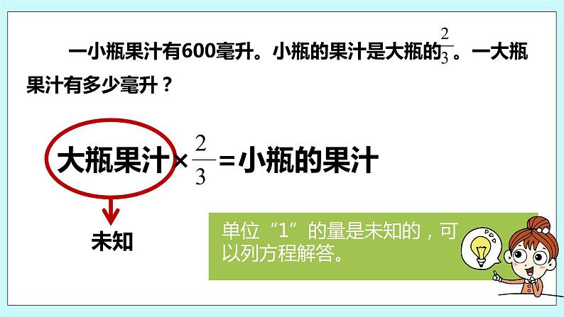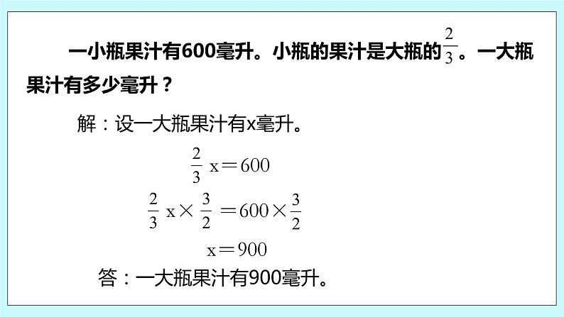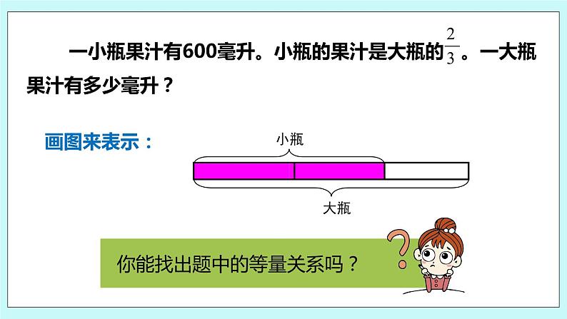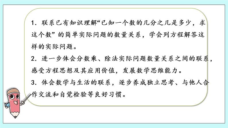 展开1.联系已有知识理解“已知一个数的几分之几是多少,求这个数”的简单实际问题的数量关系,学会列方程解答这样的实际问题。 2.进一步体会分数乘、除法实际问题数量关系之间的联系,感受方程思想及其应用价值,发展数学思维能力。 3.体会数学与生活的联系,逐步养成独立思考、与他人合作交流和自觉检验等良好习惯。