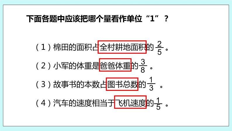 (1)棉田的面积占全村耕地面积的 。 (2)小军的体重是爸爸体重的 。 (3)故事书的本数占图书总数的 。 (4)汽车的速度相当于飞机速度的 。