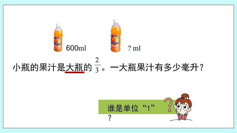 小学数学苏教版六年级上册三 分数除法图片课件ppt: 这是一份小学数学苏教版六年级上册三 分数除法图片课件ppt,共15页。PPT课件主要包含了新课导入,探索新知,求单位“1”的量,画图分析数量关系,大瓶果汁,小瓶果汁,单位“1”,大瓶的果汁量,方法二列方程解答,随堂演练等内容,欢迎下载使用。