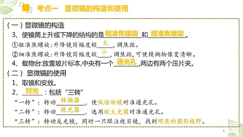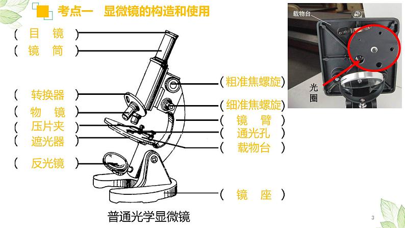 这是一份中考生物一轮复习精讲与习题精炼课件专题02 细胞是生命活动的基本单位(含答案),共35页。PPT课件主要包含了转换器,压片夹,遮光器,反光镜,粗准焦螺旋,细准焦螺旋,通光孔,载物台,普通光学显微镜,薄而透明等内容,欢迎下载使用。