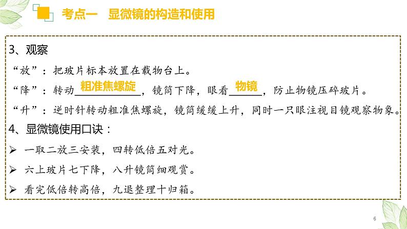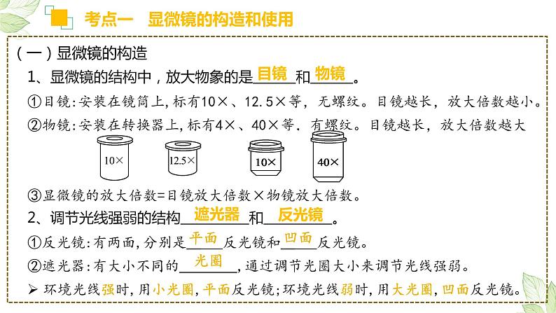 (一)显微镜的构造1、显微镜的结构中,放大物象的是 和 。①目镜:安装在镜筒上,标有10×、12.5×等,无螺纹。目镜越长,放大倍数越小。②物镜:安装在转换器上,标有4×、40×等,有螺纹。目镜越长,放大倍数越大③显微镜的放大倍数=目镜放大倍数×物镜放大倍数。2、调节光线强弱的结构 和 。①反光镜:有两面,分别是 反光镜和 反光镜。②遮光器:有大小不同的 ,通过调节光圈大小来调节光线强弱。环境光线强时,用小光圈,平面反光镜;环境光线弱时,用大光圈,凹面反光镜。