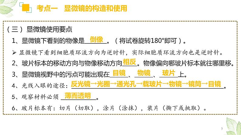 (三) 显微镜使用要点1、显微镜下看到的物像是 。(将试卷旋转180°即可)。显微镜下看到细胞质环流方向为逆时针,实际细胞质环流方向也是逆时针。2、玻片标本的移动方向与物像移动方向 。物像偏向哪玻片标本就往哪里移。3、显微镜视野中的污点可能出现在 、 、 上。4、光线入眼的途径: 。5、观察材料必须 。6、玻片标本有:切片(切取),涂片(涂抹),装片(撕下或挑取)。