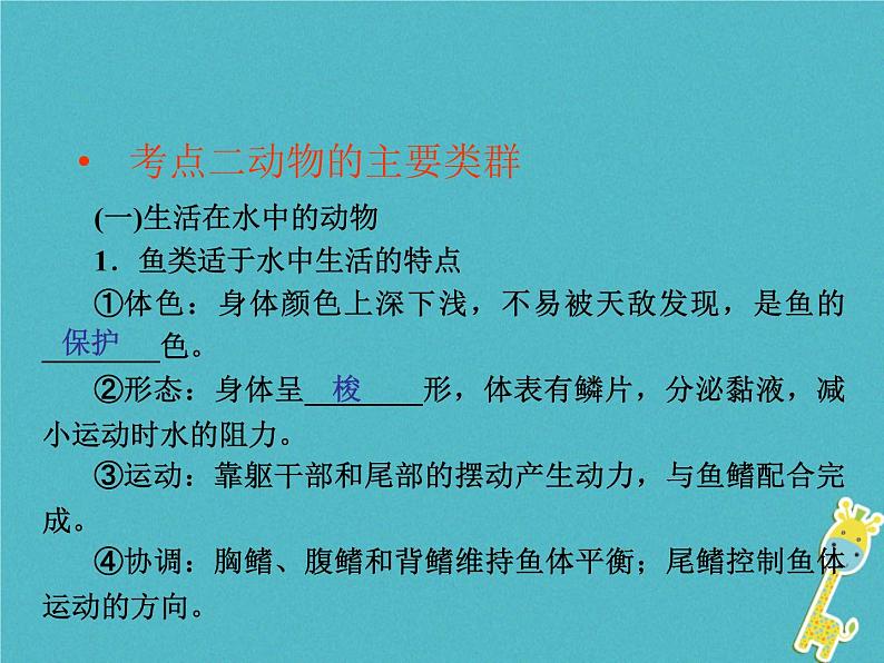 (一)生活在水中的动物1.鱼类适于水中生活的特点①体色:身体颜色上深下浅,不易被天敌发现,是鱼的________色。②形态:身体呈________形,体表有鳞片,分泌黏液,减小运动时水的阻力。③运动:靠躯干部和尾部的摆动产生动力,与鱼鳍配合完成。④协调:胸鳍、腹鳍和背鳍维持鱼体平衡;尾鳍控制鱼体运动的方向。