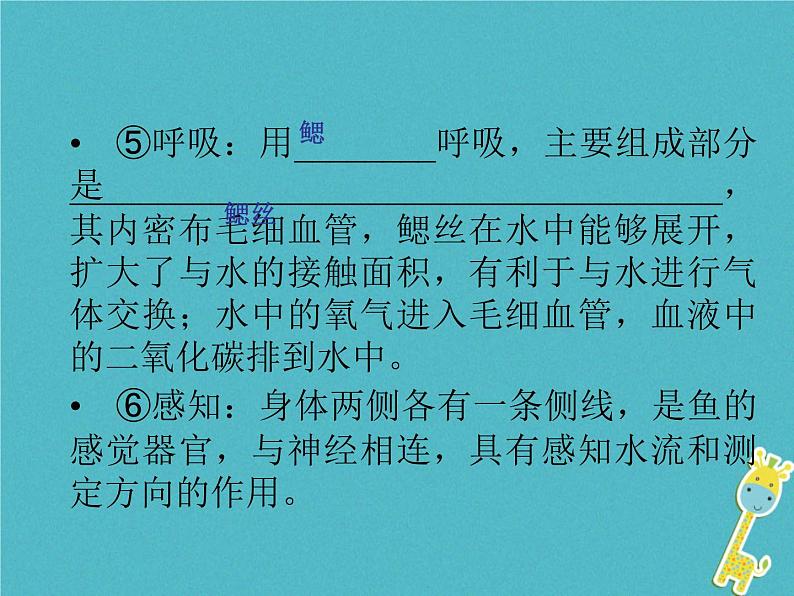 ⑤呼吸:用________呼吸,主要组成部分是_____________________________________,其内密布毛细血管,鳃丝在水中能够展开,扩大了与水的接触面积,有利于与水进行气体交换;水中的氧气进入毛细血管,血液中的二氧化碳排到水中。⑥感知:身体两侧各有一条侧线,是鱼的感觉器官,与神经相连,具有感知水流和测定方向的作用。