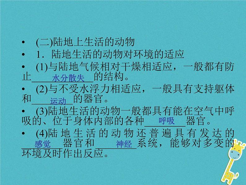 (二)陆地上生活的动物1.陆地生活的动物对环境的适应(1)与陆地气候相对干燥相适应,一般都有防止____________的结构。(2)与不受水浮力相适应,一般具有支持躯体和________的器官。(3)陆地生活的动物一般都具有能在空气中呼吸的、位于身体内部的各种________器官。(4)陆地生活的动物还普遍具有发达的________器官和________系统,能够对多变的环境及时作出反应。