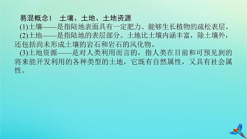 易混概念1 土壤、土地、土地资源(1)土壤——是指陆地表面具有一定肥力、能够生长植物的疏松表层。 (2)土地——是指陆地的表层部分。土地比土壤内涵丰富,除土壤外,还包括尚未形成土壤的岩石和岩石的风化物。(3)土地资源——是对人类利用而言的,指人类在目前和可预见到的将来能开发利用的各种类型的土地,它既有自然属性,又具有社会属性。
