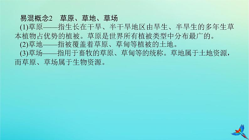 易混概念2 草原、草地、草场(1)草原——指生长在干旱、半干旱地区由旱生、半旱生的多年生草本植物占优势的植被。草原是世界所有植被类型中分布最广的。 (2)草地——指被覆盖着草原、草甸等植被的土地。 (3)草场——指用于畜牧的草原、草甸等的统称。草地属于土地资源,而草原、草场属于生物资源。