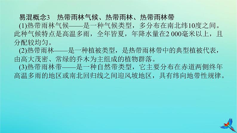 易混概念3 热带雨林气候、热带雨林、热带雨林带(1)热带雨林气候——是一种气候类型,多分布在南北纬10度之间。此种气候特点是高温多雨,全年皆夏,年降水量在2 000毫米以上,且分配较均匀。 (2)热带雨林——是一种植被类型,是热带雨林带中的典型植被代表,由高大茂密、常绿的乔木为主组成的植物群落。 (3)热带雨林带——是一种自然带类型,它主要分布在赤道两侧终年高温多雨的地区或南北回归线之间迎风坡地区,具有纬向地带性规律。