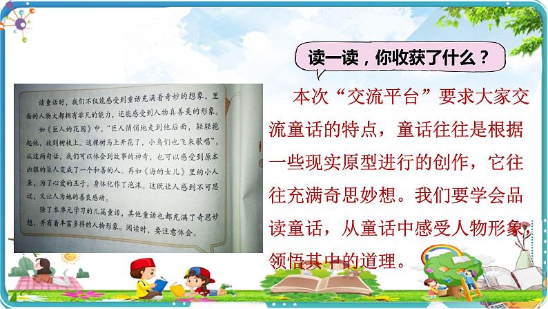 本次“交流平台”要求大家交流童话的特点,童话往往是根据一些现实原型进行的创作,它往往充满奇思妙想。我们要学会品读童话,从童话中感受人物形象,领悟其中的道理。