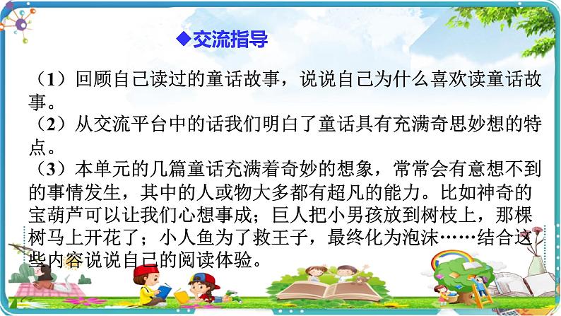 (1)回顾自己读过的童话故事,说说自己为什么喜欢读童话故事。(2)从交流平台中的话我们明白了童话具有充满奇思妙想的特点。(3)本单元的几篇童话充满着奇妙的想象,常常会有意想不到的事情发生,其中的人或物大多都有超凡的能力。比如神奇的宝葫芦可以让我们心想事成;巨人把小男孩放到树枝上,那棵树马上开花了;小人鱼为了救王子,最终化为泡沫……结合这些内容说说自己的阅读体验。