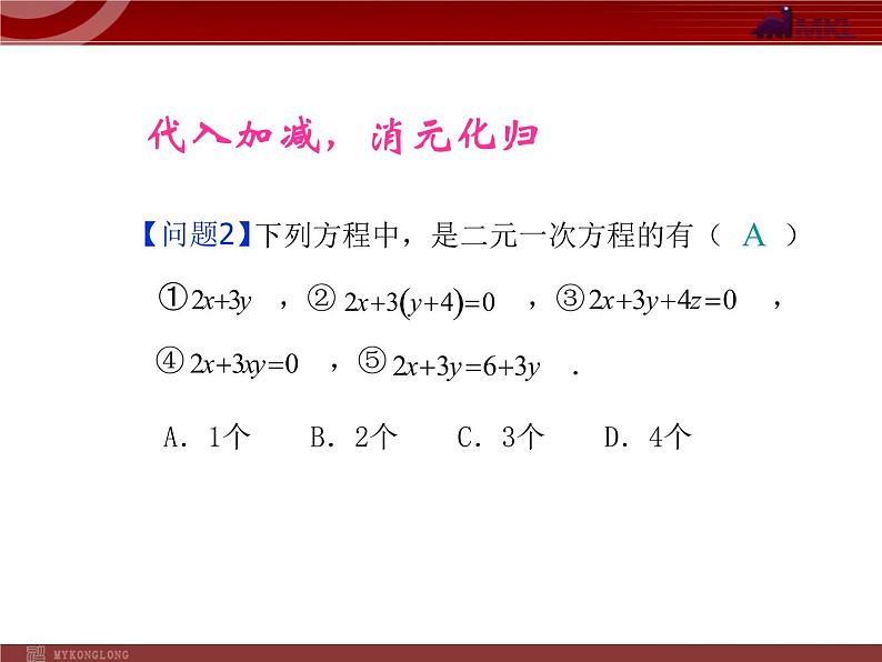 第八章 二元一次方程组知识梳理,掌握方法 【问题1】本章学习了哪些知识?它们之间的联系是什么? 实际问题数学问题(二元或三元一次方程组)实际问题的答案 数学问题的解 (二元或三元一次方程组的解)检验代入法加减法(消元)解方程组设未知数,列方程组代入加减,消元化归 下列方程中,是二元一次方程的有( ),②,③④,⑤A.1个 B.2个 C.3个 D.4个【问题2】①.,A代入加减,消元化归 【问题3】解下列方程组:⑵⑶⑷⑴代入加减,消元化归 【问题3】解下列方程组:⑴① ② 解:由①,得. ③..代入③,得所以这个方程组的解是把③代入②,得解这个方程,得把.代入加减,消元化归 ⑵【问题3】解下列方程组:① ② 解:①-②,得解这个方程,得把代入①,得解这个方程,得所以这个方程组的解是....代入加减,消元化归 【问题3】解下列方程组:⑶① ② 解:化简,得由①,得把③代入②,得解这个方程,得把代入③,得所以这个方程组的解是. ③...代入加减,消元化归 【问题3】解下列方程组:⑷① ② ③ 实际应用,提高能力 【问题4】1号仓库与2号仓库共存粮450吨,现从1号仓库运出存粮的60%,从2号仓库运出存粮的40%,结果2号仓库所余的粮食比1号仓库所余的粮食多30吨.1号仓库与2号仓库原来各存粮多少吨?等量关系: ①1号仓库存粮数+2号仓库存粮数=450; ②1号仓库余粮数+30=2号仓库余粮数.解:设1号仓库原来存粮 吨,2号仓库原来存粮 吨,根据题意,得 解这个方程组,得答:1号仓库原来存粮240吨,2号仓库原来存粮210吨.实际应用,提高能力 【问题5】一个三位数,各个数位上的数字之和是16,个位上的数字是百位上的数字的2倍,十位上的数字与百位上的数字之和比个位上的数字大4,求这个三位数?等量关系: ①个位上的数字+十位上的数字+百位上的数字=16; ②个位上的数字=百位上的数字×2;③十位上的数字+百位上的数字=个位上的数字+4.解:设个位上的数字是 ,十位上的数字是 ,百位上的数字是 , 根据题意,得解这个方程组,得 所以这个三位数是376.答:这个三位数是376.归纳小结,布置作业 通过对本章内容的复习,你有哪些新的收获?你还有什么困惑?归纳小结,布置作业 作业:1.复习题8第1⑶、2⑶、3⑵、4⑵、6、7题.2.(选做题)复习题8第9、11题.