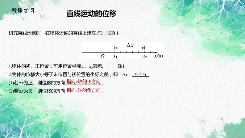 研究直线运动时,在物体运动的直线上建立x轴,如图1.1.物体的初、末位置:可用位置坐标x1、x2表示.2.物体的位移大小等于末位置与初位置的坐标之差,即:Δx= .(1)若Δx为正,则位移的方向 ;(2)若Δx为负,则位移的方向 .