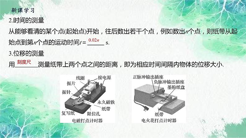 2.时间的测量从能够看清的某个点(起始点)开始,往后数出若干个点,例如数出n个点,则纸带从起始点到第n个点的运动时间t= s.3.位移的测量用 测量纸带上两个点之间的距离,即为相应时间间隔内物体的位移大小.