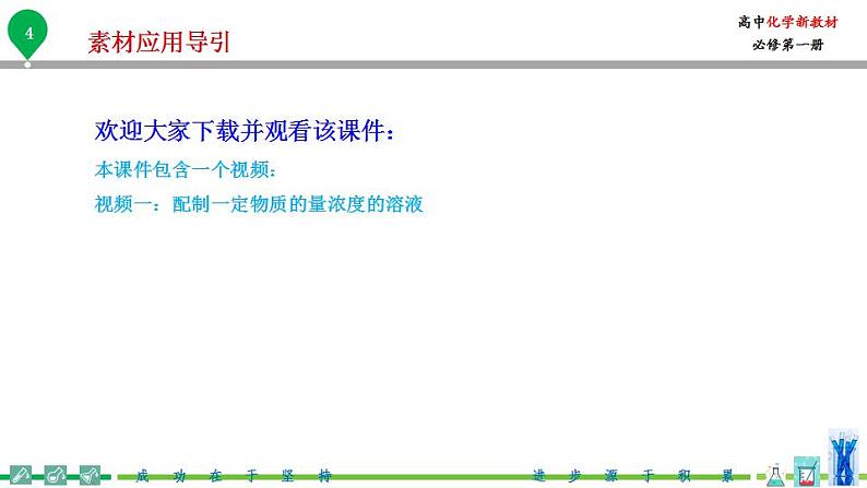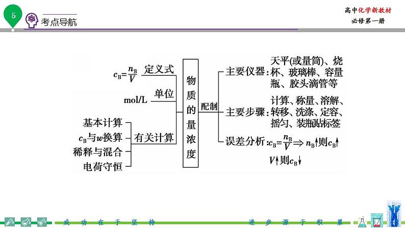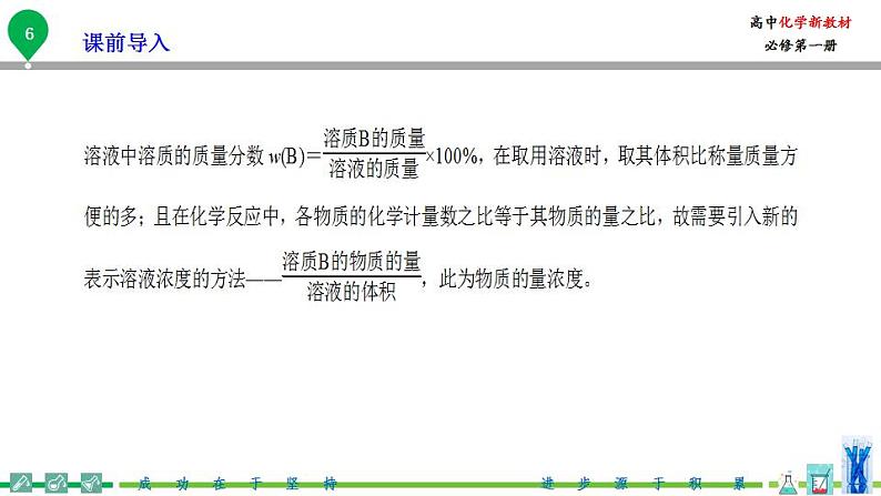 高中化学新教材特点分析及教学策略(一)化学基本概念和化学基本理论:全套教材的知识安排,注意各年级内及各年级间的联系,在保证知识结构的系统性和完整性的同时,对内容的安排采用了将各部分知识分散处理,相对集中的方法。(二)元素化合物知识:关于元素化合物知识,高一教材首先介绍了碱金属和卤素两个最典型的金属族和非金属族。(三)化工基础知识:高一介绍了硅酸盐工业和环境保护知识。高二主要介绍合成氨工业,删掉了硝酸工业、钢铁工业和铝的冶炼。重点突出了合成氨工业中合成氨条件的选择。知识点一:一、物质的量浓度1.溶质的质量分数(1)定义:溶液中的 质量与 质量之比。(2)定义式:w= 。(3)20%的NaCl溶液可表示 。2.物质的量浓度(1)定义:单位体积的 里所含溶质B的 。符号为 。(2)定义式及单位:cB=,单位 。(3)意义:1 mol/L NaCl溶液表示 。微警示【即学即练1】1.下列溶液中,跟200mL 1 mol·L-1 NaCl溶液所含的Cl-物质的量浓度相同的是A.100mL 0.5 mol·L-1MgCl2溶液 B.200mL 1 mol·L-1 CaCl2溶液C.50ml 4 mol·L-1 NaCl溶液 D.25ml 0.5 mol·L-1HCl溶液2.0.5L1mol/L的FeCl3溶液与0.2L1mol/L的KCl溶液中Cl—的数目之比是A.1:3 B.3:1 C.15:2 D.5:23.下列溶液的物质的量浓度为1 mol/L的是A.将40 g NaOH溶解于1 L水中B.将0.5 mol Na2O加入适量水中,配成1 L溶液C.将100 mL2 mol/LNaCl溶液移去50 mL后剩余的溶液D.将11.2 LHCl气体通入水配成0.5 L的溶液4.下列溶液中Cl-浓度与50mL 1mol∙L-1AlCl3溶液中Cl-浓度相等的是A.150mL 1mol∙L-1 NaCl溶液 B.75mL 2mol∙L-1 NH4Cl溶液C.150mL3mol∙L-1 KCl溶液 D.75mL2mol∙L-1 FeCl3溶液知识点二: 二、配制一定物质的量浓度的溶液1.容量瓶简介微警示2.配制步骤(1)配制100 mL 1.00 mol·L-1氯化钠溶液