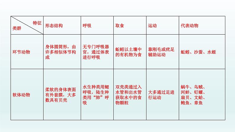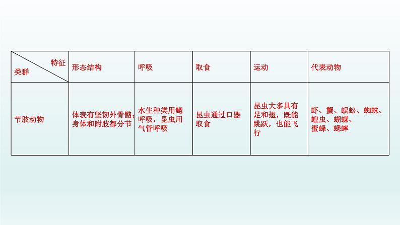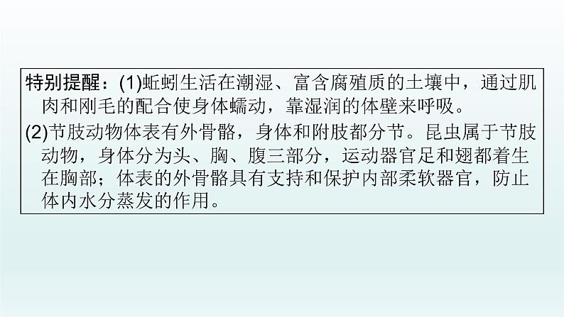 特别提醒:(1)蚯蚓生活在潮湿、富含腐殖质的土壤中,通过肌肉和刚毛的配合使身体蠕动,靠湿润的体壁来呼吸。(2)节肢动物体表有外骨骼,身体和附肢都分节。昆虫属于节肢动物,身体分为头、胸、腹三部分,运动器官足和翅都着生在胸部;体表的外骨骼具有支持和保护内部柔软器官,防止体内水分蒸发的作用。
