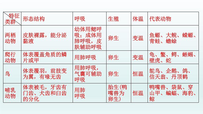(4)鸟类:体表覆羽;前肢变成翼,胸肌发达;骨中空,直肠短;有气囊辅助肺呼吸;恒温。(5)哺乳动物:体表被毛;胎生、哺乳;体恒定。