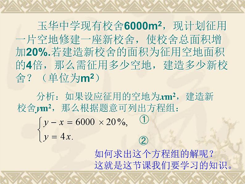 分析:如果设应征用的空地为xm2,建造新校舍ym2,那么根据题意可列出方程组: