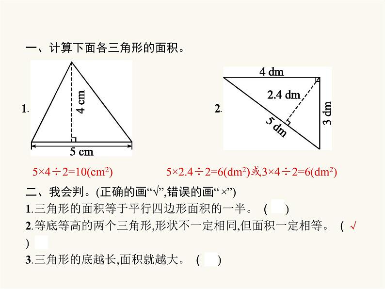 二、我会判。(正确的画“√”,错误的画“×”)1.三角形的面积等于平行四边形面积的一半。 ( × )2.等底等高的两个三角形,形状不一定相同,但面积一定相等。 ( √ )3.三角形的底越长,面积就越大。 ( × )