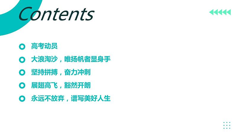 这是一份高考动员:扬帆启航,浩浩荡荡迎高考课件PPT,共17页。PPT课件主要包含了Contents,高考动员,考前复习集中精力,收心调整保持冷静,心态管理正面思考,坚持拼搏奋力冲刺,学科综合提高,多练习模拟考试,展翅高飞豁然开朗,热身引导自信准备等内容,欢迎下载使用。