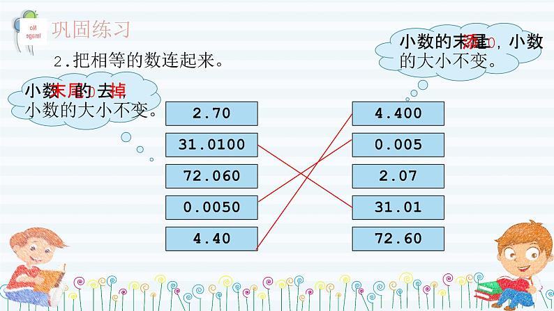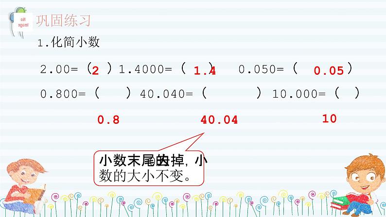 小数的性质:小数的末尾添上“0” 或去掉“0”,小数的大小不变。