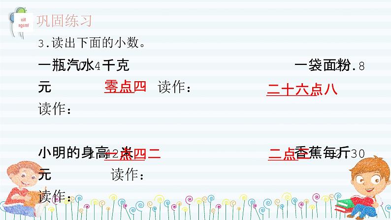 一瓶汽水0.4千克 一袋面粉26.8元 读作: 读作: