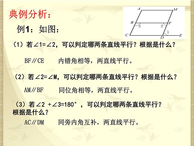 1:如图,选择合适的内容填空。(1)因为AB//CD 所以∠1=∠2( )(2)因为∠3=∠1 所以 //____(同位角相等,两直线平行) (3)因为∠1+∠ =180 ,所以AB//CD( )