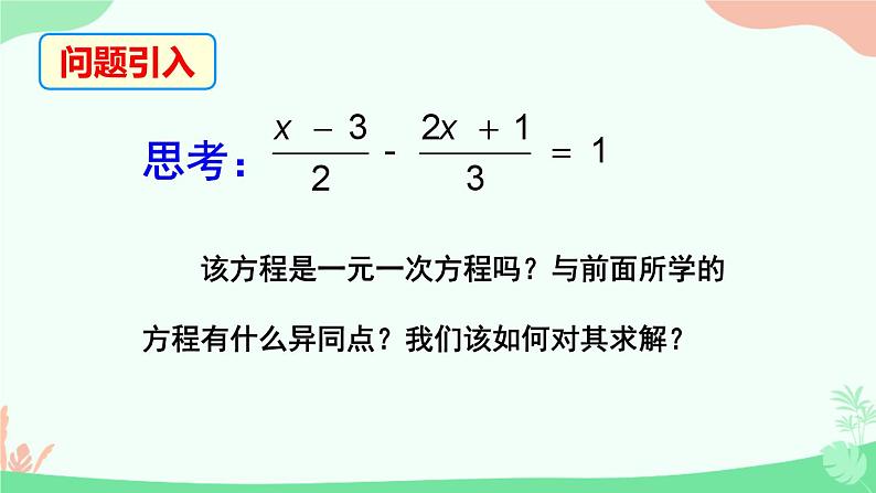 展开思考: 该方程是一元一次方程吗?与前面所学的方程有什么异同点?我们该如何对其求解?