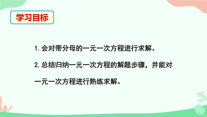 1.会对带分母的一元一次方程进行求解。2.总结归纳一元一次方程的解题步骤,并能对一元一次方程进行熟练求解。