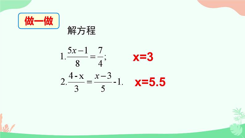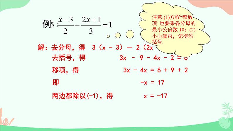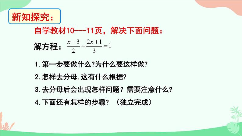 1.第一步要做什么?为什么要这样做? 2.怎样去分母,这有什么根据? 3.去分母后会出现怎样问题?需要注意什么? 4.下面还有怎样的步骤? (独立完成)