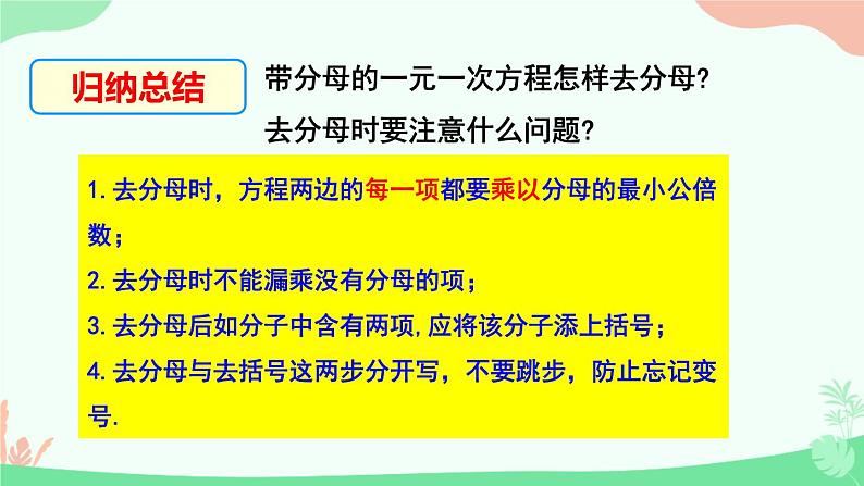 1.去分母时,方程两边的每一项都要乘以分母的最小公倍数;2.去分母时不能漏乘没有分母的项;3.去分母后如分子中含有两项,应将该分子添上括号;4.去分母与去括号这两步分开写,不要跳步,防止忘记变号.