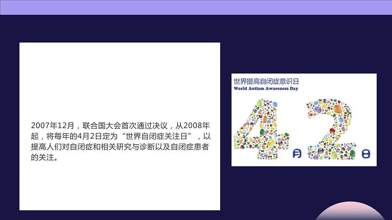 2007年12月,联合国大会首次通过决议,从2008年起,将每年的4月2日定为“世界自闭症关注日”,以提高人们对自闭症和相关研究与诊断以及自闭症患者的关注。