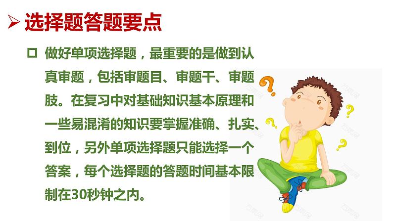 做好单项选择题,最重要的是做到认真审题,包括审题目、审题干、审题肢。在复习中对基础知识基本原理和一些易混淆的知识要掌握准确、扎实、到位,另外单项选择题只能选择一个答案,每个选择题的答题时间基本限制在30秒钟之内。