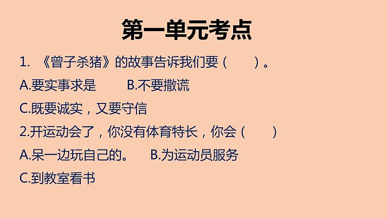 1. 《曾子杀猪》的故事告诉我们要( )。A.要实事求是 B.不要撒谎 C.既要诚实,又要守信2.开运动会了,你没有体育特长,你会( )A.呆一边玩自己的。 B.为运动员服务 C.到教室看书